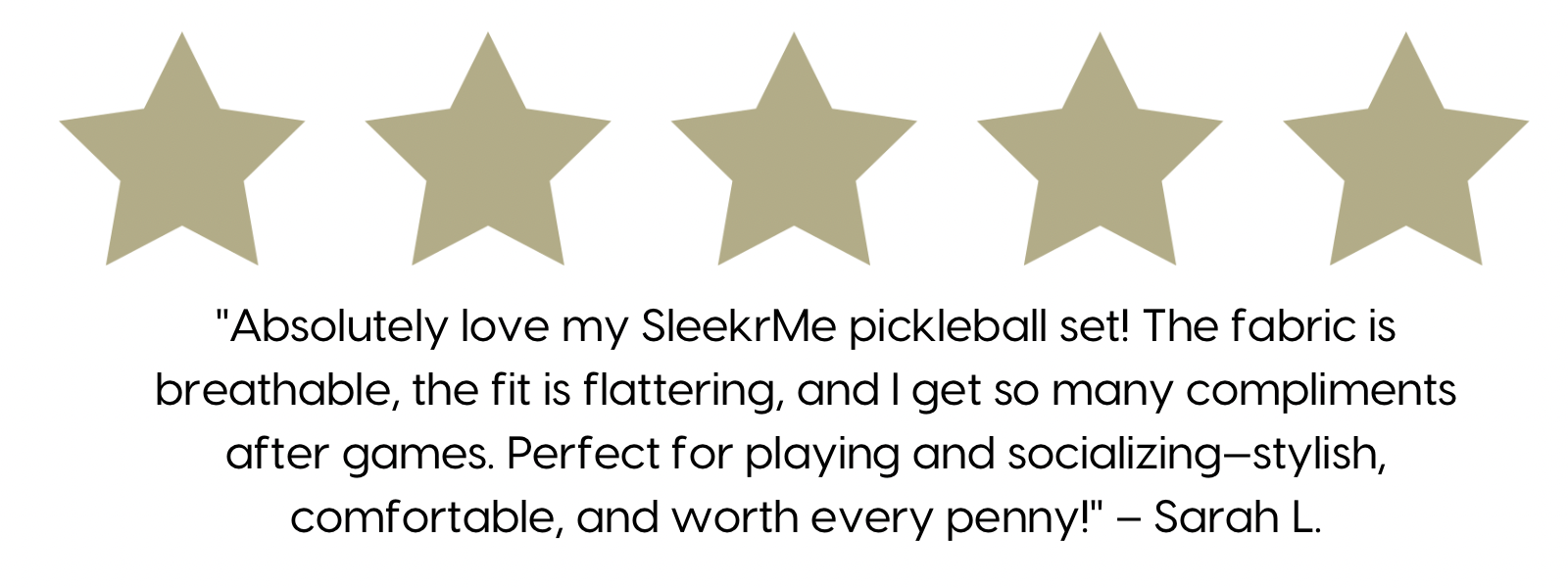 "Absolutely love my SleekrMe pickleball set! The fabric is breathable, the fit is flattering, and I get so many compliments after games. Perfect for playing and socializing—stylish, comfortable, and worth every penny!" – Sarah L.